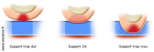 Le bon support est celui où la personne s’enfonce légèrement mais où elle est soutenue partout de la même manière. La surface de contact est plus grande et la pression, répartie uniformément, est donc bien moindre.